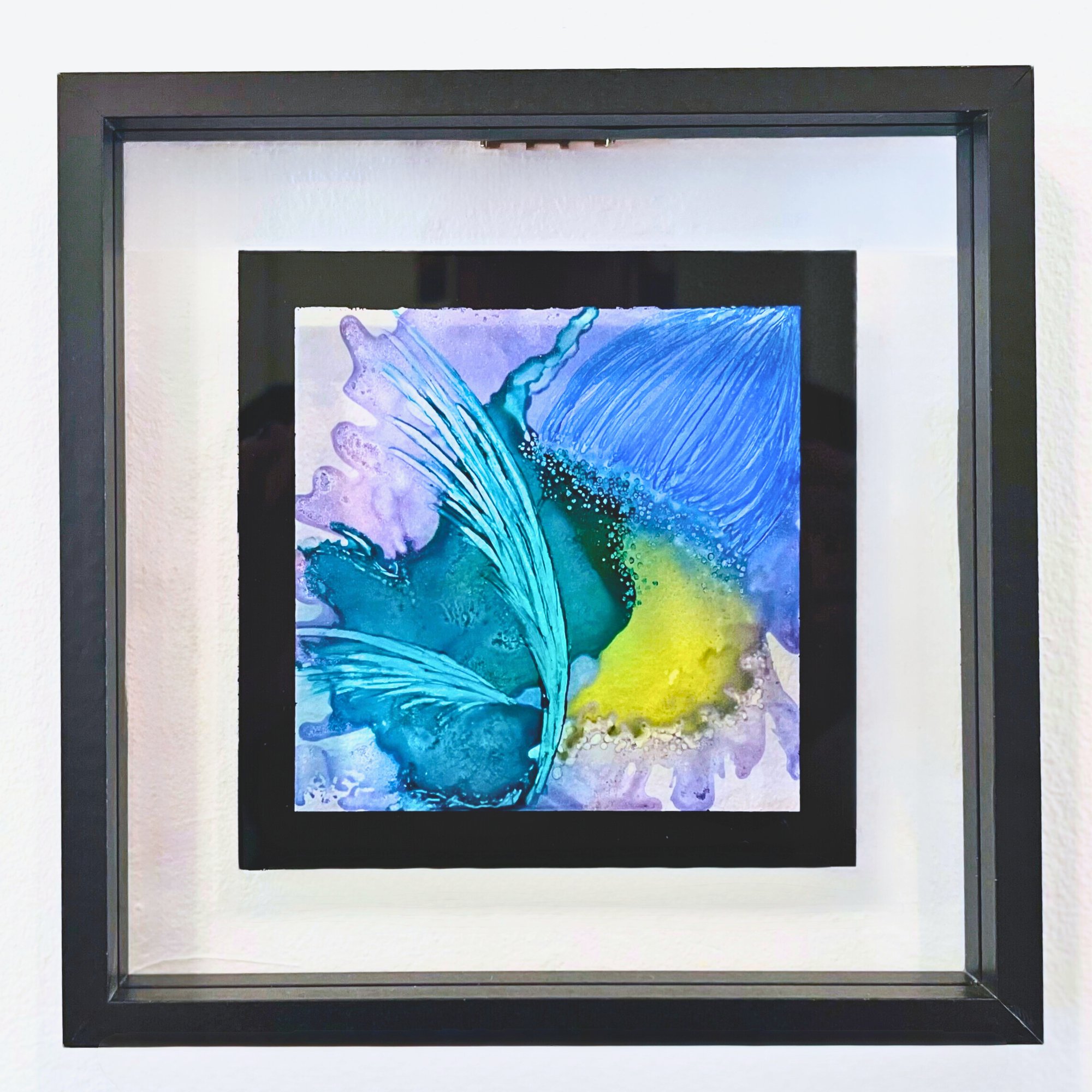 Alcohol ink, acrylic, and metallic ink on transparent glass with a wooden frame in a float style, sealed for scratch and UV resistance.