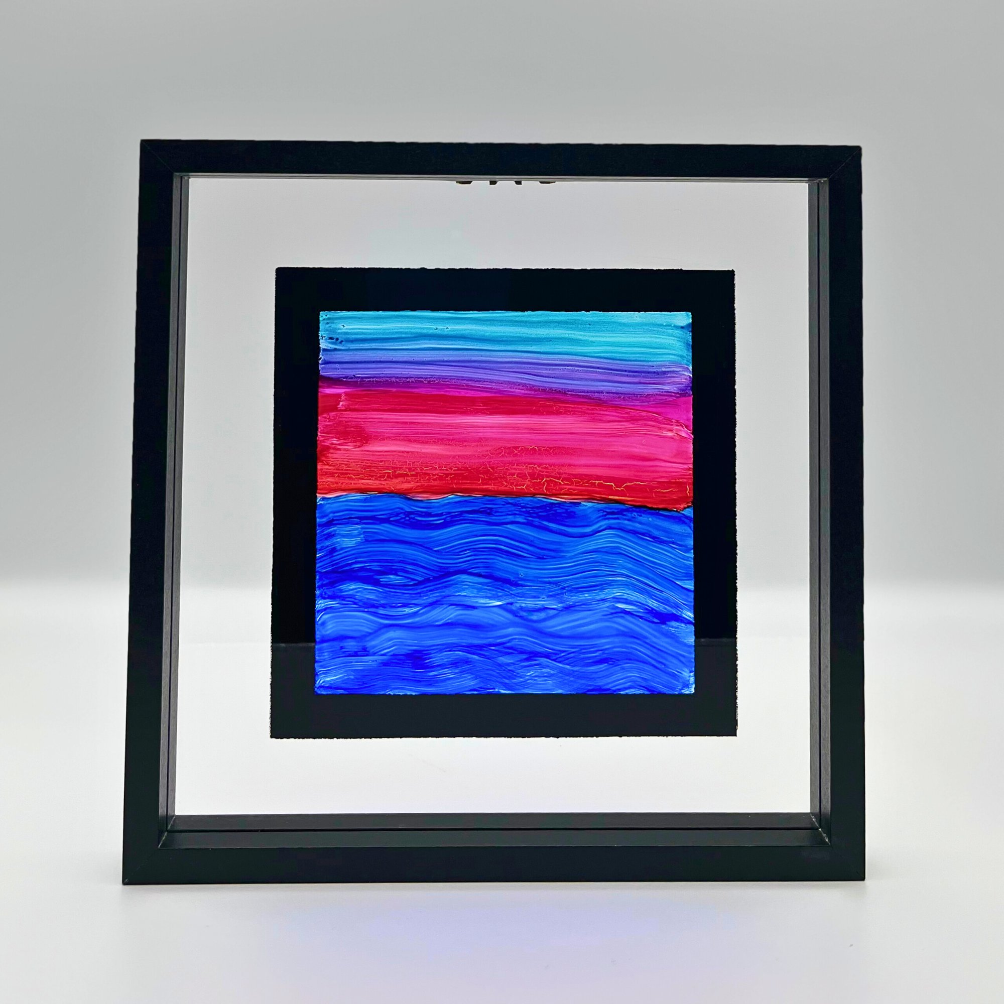 Alcohol ink, acrylic, and metallic ink on transparent glass with a wooden frame in a float style, sealed for scratch and UV resistance.
